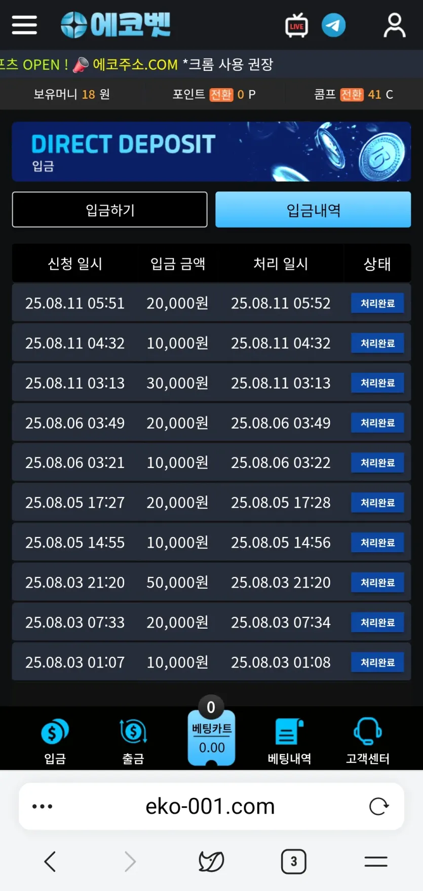 안녕하세요. 에코벳 싸이트 소개해봅니다 다양한 이벤트에 대박맛집이라고 홍보많네요. 호기심에 가입해서 이용해밧는데 요즘 빠져있네요 .저는 비록 소액 유저지반 고액 소액 상관없음요ㅡ 충환 초스피드 겁나 빠름. 이용해보시면 다른데 못갑니다. 게임하기 너무좋아요. 고객센터도너무 친절하고 응대가 빨라요. 한번만 이용해보세여. 절대 후회안할거에요. < 완전 안전사이트라는것 >