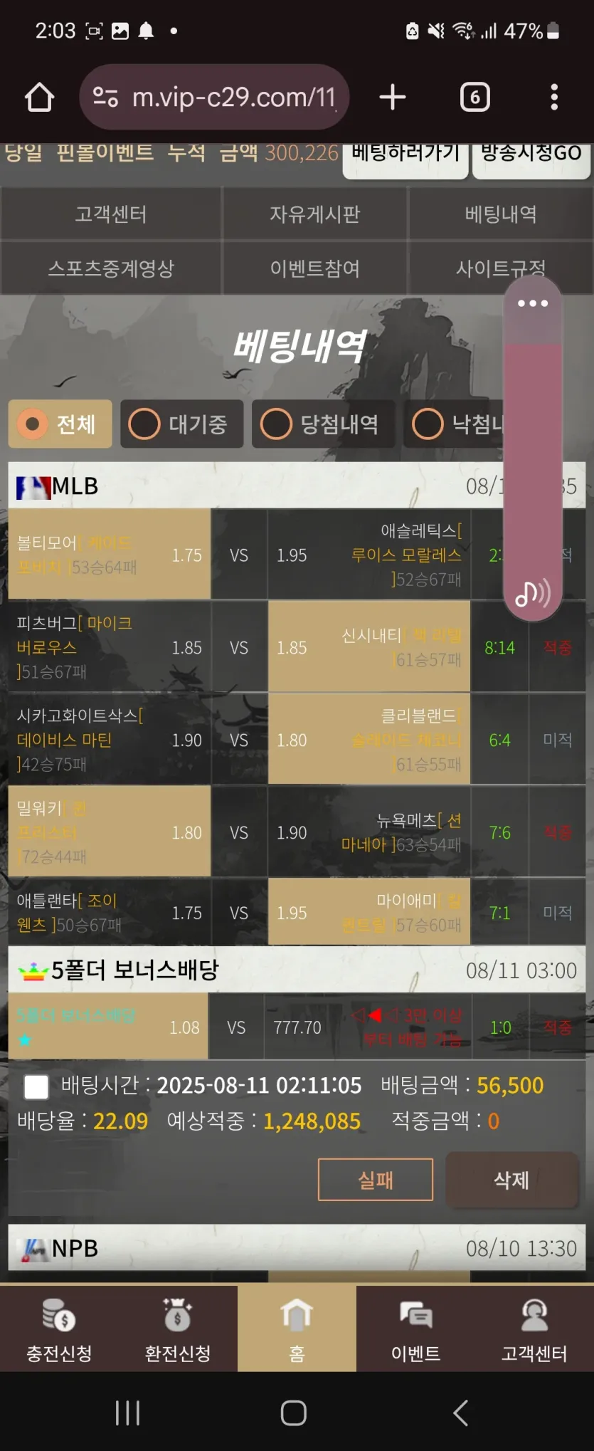 일품에서 스포츠 매출 받고 믈브 배팅했는데 요새 믈브가 어려워서 미당첨이네요 ㅠㅠ 다음기회에는 건승했으면 좋겟어요