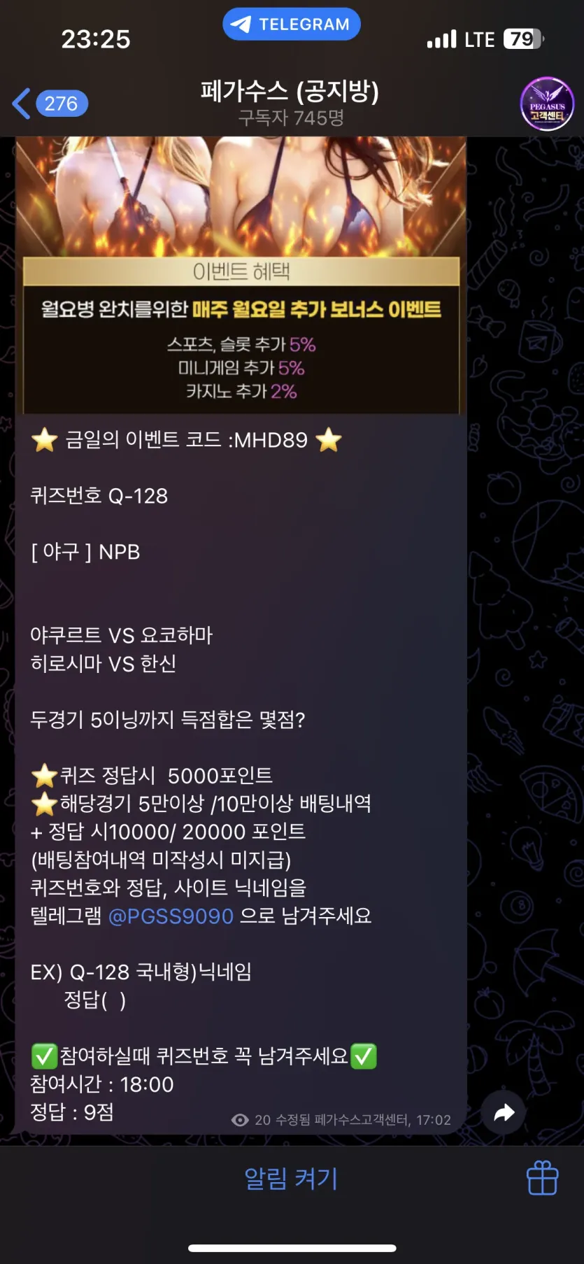 페가수스 후기 미쎄스추 비제휴 1 1014 1 08.11 23:26 텔래그램 돌발퀴즈 및 이벤트 진행되고 기존 이벤트도 페이백 등 다양하게 있습니다 충전 환전 진짜 빠르고 신규가입 받고있으니 페가수스 꼭 이용해보세요 1